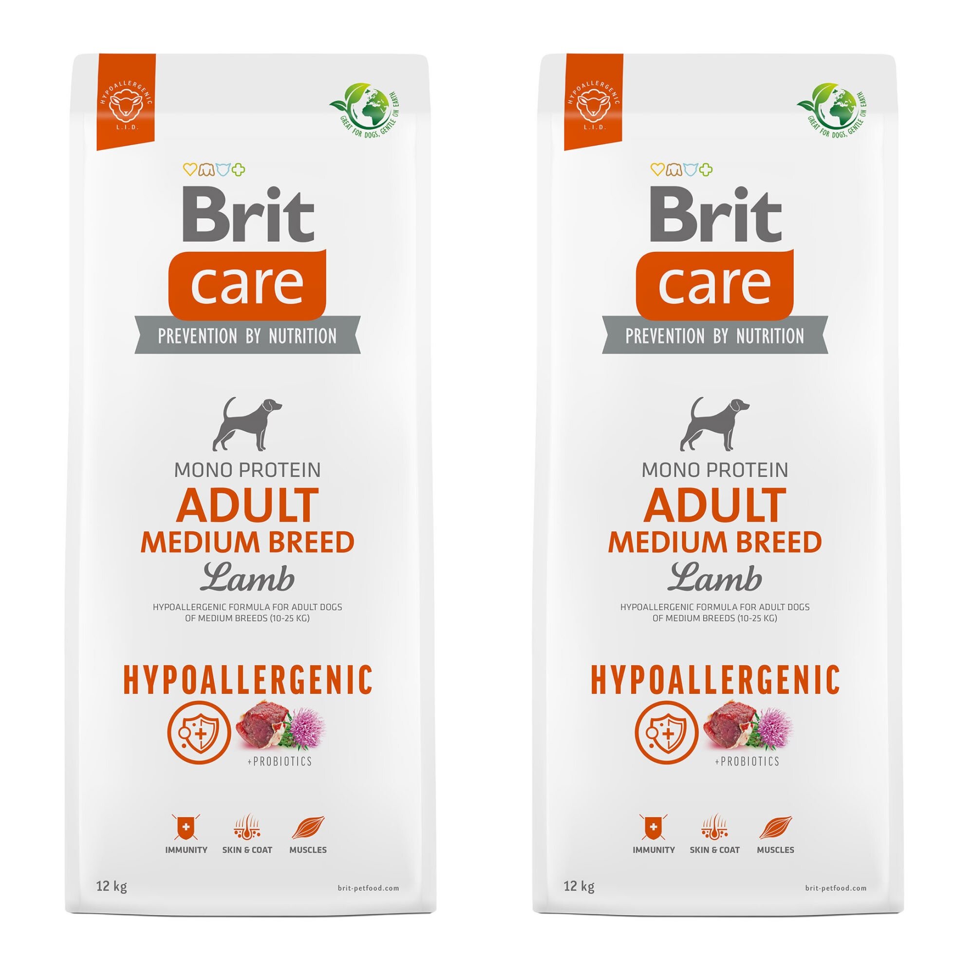 Brit Care Hypoallergenic Medium 2×12 kg – compleet droogvoer met lamsvlees & rijst voor volwassen middelgrote honden. Hypoallergeen, graanvrij en goed voor huid, vacht & spijsvertering.