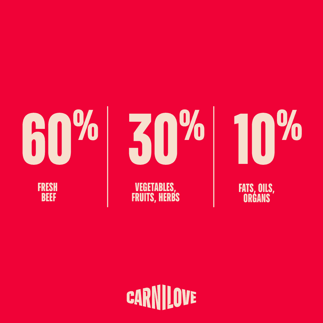 Samenstelling: vers rundvlees (60 %), gele erwten, rundvet (5 %), gehydrolyseerde lever (3 %), kikkererwten (3 %), pompoen (3 %), rode linzen, zalmolie (2 %), lijnzaad, eierschalen, gedroogde appelpulp (1,3 %), wortel, kaliumchloride, erwtenmeel, gedroogde duindoorn (0,2 %), gedroogde gemberwortel (0,1 %), gedroogde bosbessen (0,1 %), gedroogde rozemarijn (0,1 %), gedroogde veenbessen (0,1 %), gedroogde tijm (0,1 %), gehydrolyseerde schalen van schaaldieren (bron van glucosamine, 0,022 %), cichoreiwortel (bron van fructo-oligosacchariden, 0,0163 %), kraakbeen extract (bron van chondroïtine, 0,014 %), biergist (bron van mannan-oligosacchariden, 0,013 %), yucca schidigera (0,085 %).