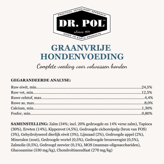 Dr. Pol Adult Zalm kopen? Graanvrij hondenvoer met zalm, prebiotica en omega-3. Zonder kunstmatige toevoegingen. Verkrijgbaar bij Chewies Dierenwinkel!