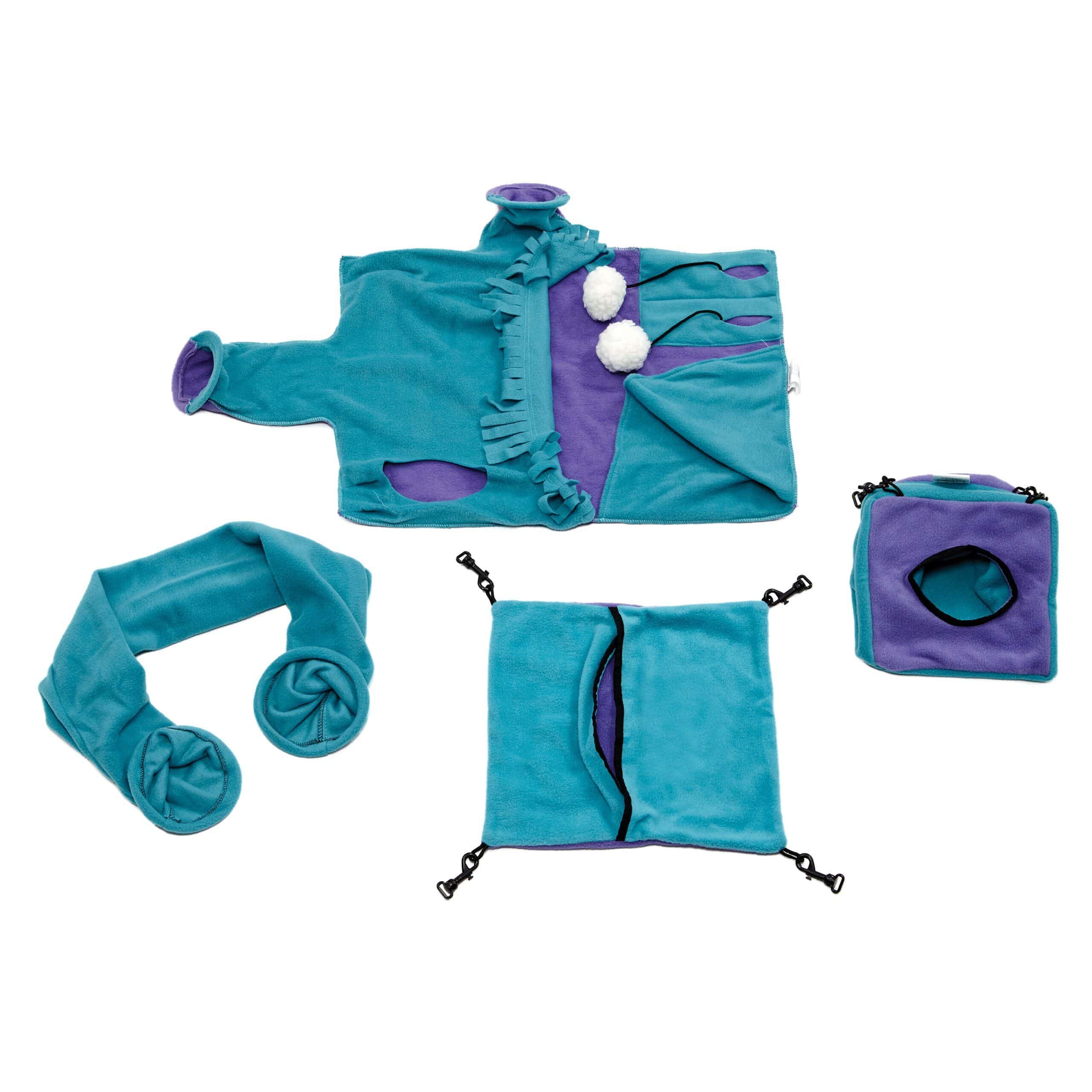 The Nations Accessories Kit 3 includes 1 Cozy Cube, 1 Busy Body Blankie, 1 Hide & Seek Tunnel, 1 Hammock Hideaway in one convenient bundle. All pieces are compatible with all Ferret Nation® and Critter Nation® Habitats (models 181, 182, 183, 161, 162, 163). Cage is not included.